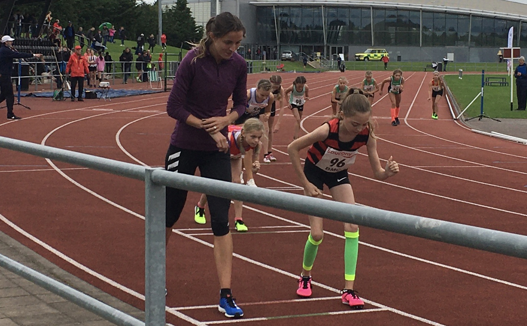 Lucy Wright shared the outside lane around the first bend with Great Britain senior international Jess Judd, who acted as a “celebrity” pacemaker for the two girls races. Wright finished seventh in 2:39.62.