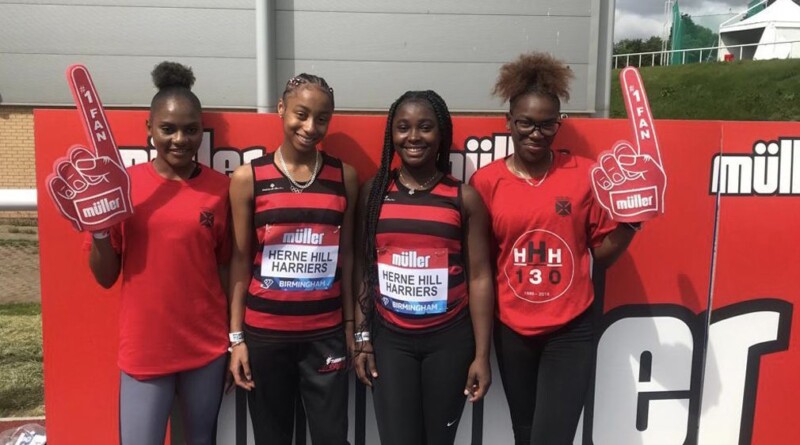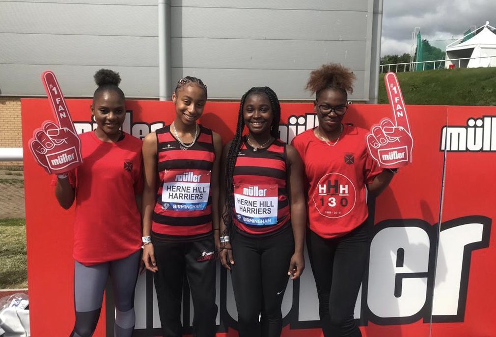 Herne Hill Harriers’ U20 women’s 4x100m A team set a new club record in the Club Connect Relays for younger athletes at the start of the Wanda Diamond League meeting in Birmingham, writes Geoff Jerwood.