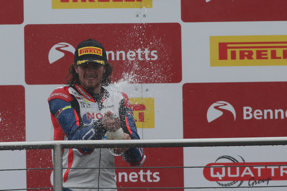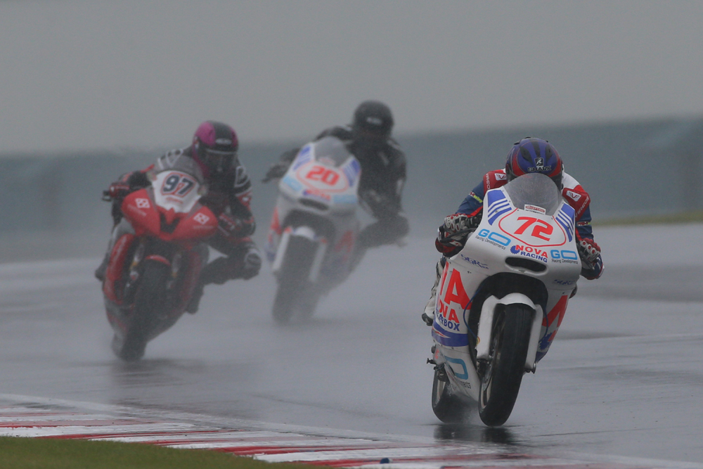 The Lewisham rider started 20th on the grid (6th in class) on the combined GP2/Supersport grid at a rain soaked Donington Park. Despite the conditions, the Chassis Factory Nova Go Racing rider continually posted faster lap times than his GP2 rivals hauling them in one by one to take victory in race one in the Moto2 category.