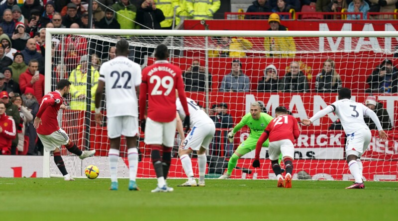 Erik ten Hag’s side were awarded a penalty in the seventh minute when a cross from Marcus Rashford hit Will Hughes’ hand.