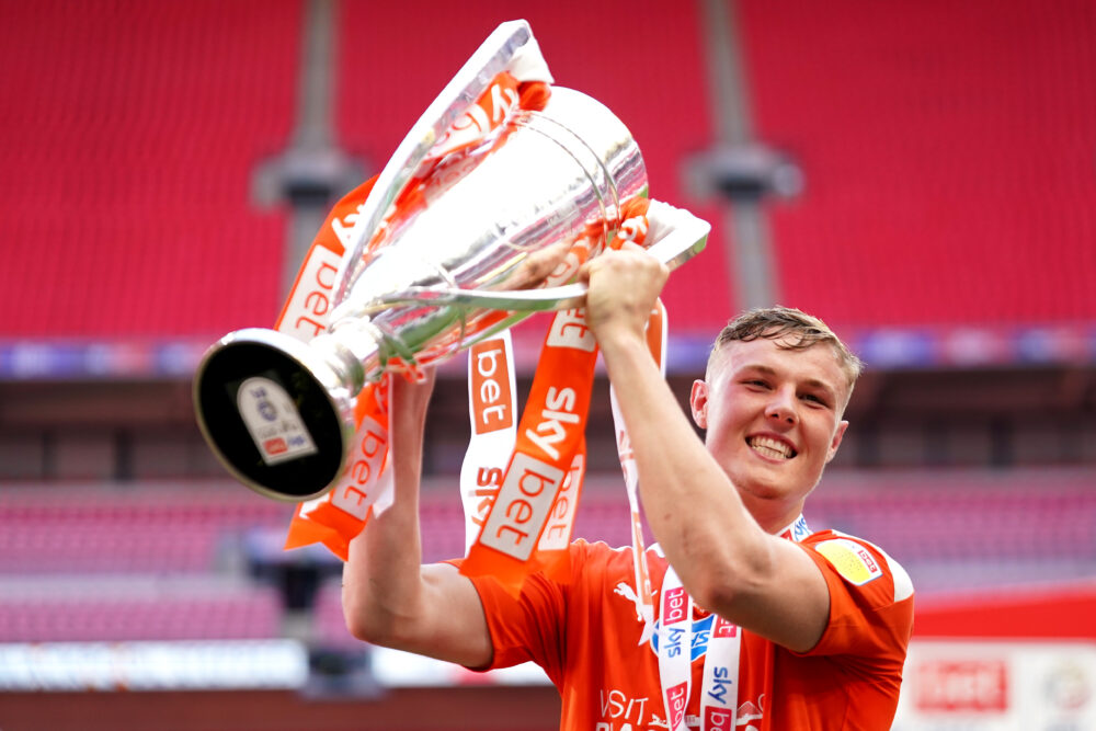 Blackpool’s Daniel Ballard celebrates with the trophy after the final whistle during the Sky Bet League One playoff final match held at Wembley Stadium, London. Picture date: Sunday May 30, 2021.
