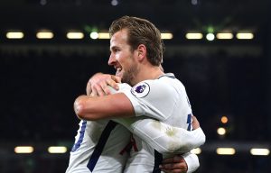 Tottenham Hotspur’s Harry Kane celebrates scoring his side’s third goal of the game and his hat-trick with Dele Alli (left) during the Premier League match at Turf Moor, Burnley.