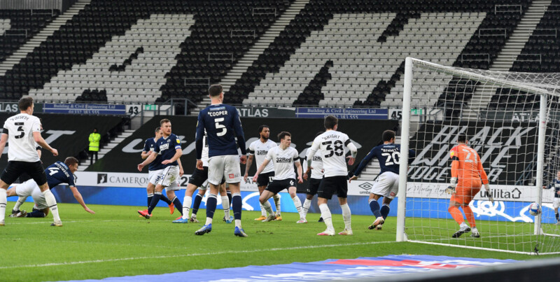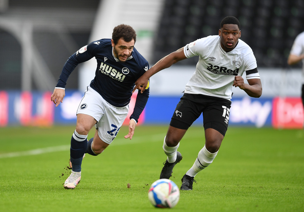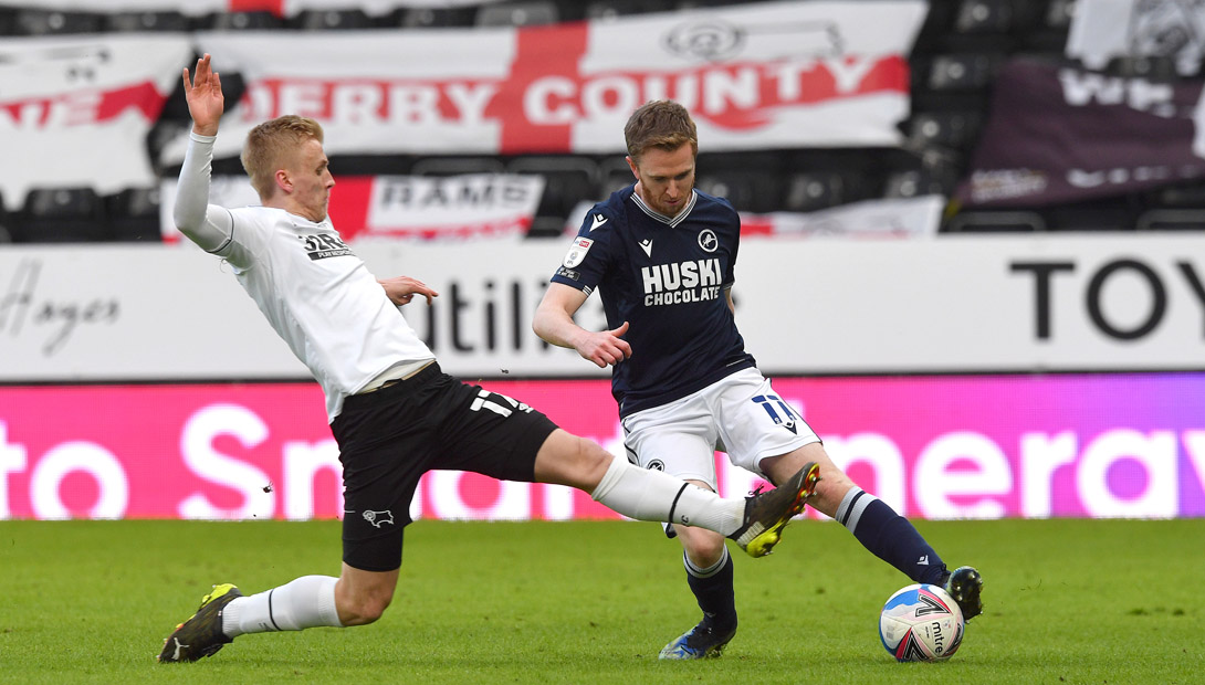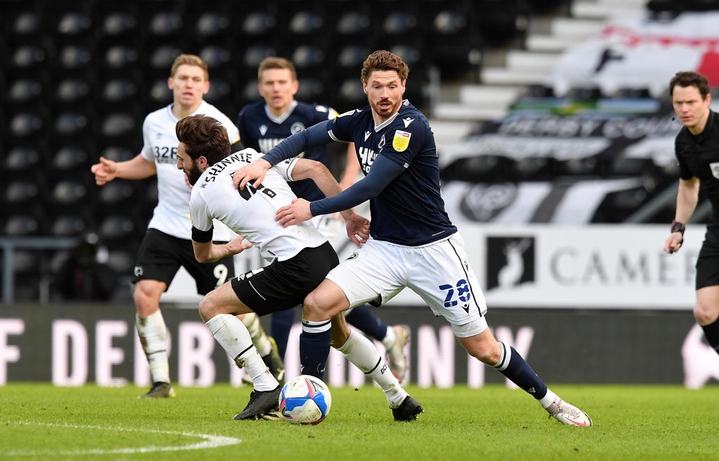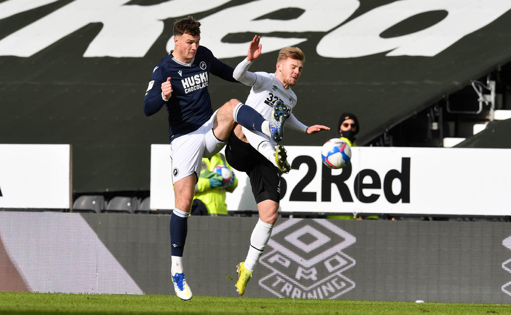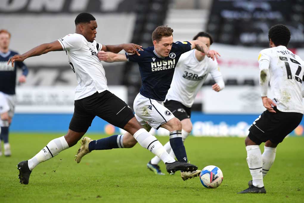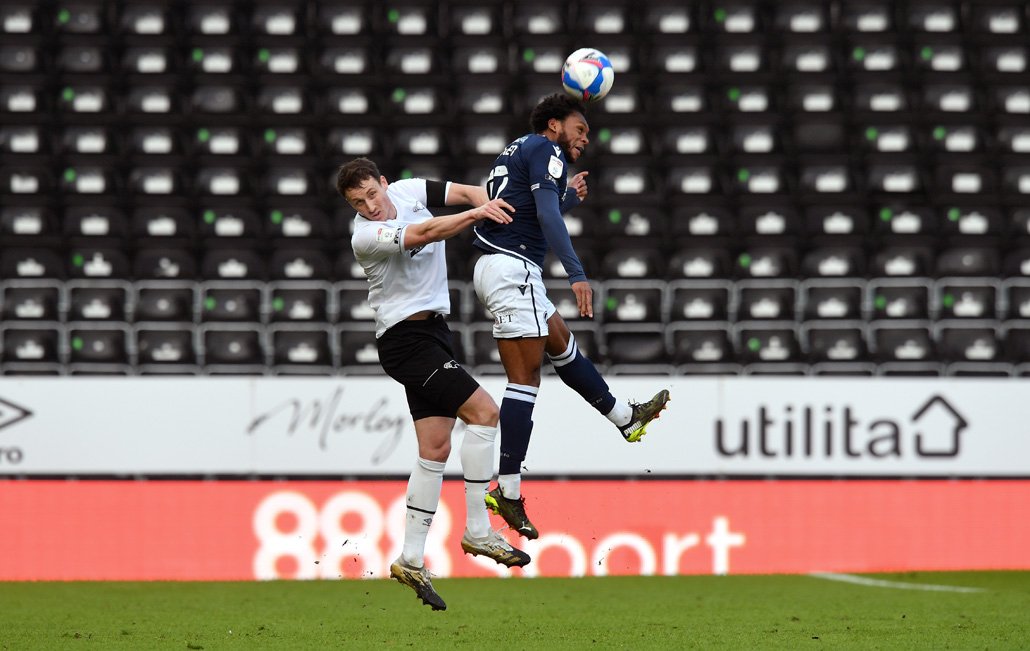 Millwall managed just 18 passes in their hosts’ half in the opening 45 minutes as Derby kept possession and floated a number of balls into the box with Byrne and Jozwaik linking up well. They were getting the better of the returning Murray Wallace – the Scot having been absent since the 2-1 defeat to Coventry on January 2 with a broken foot. For all of those crosses it was just those two headers from Forsyth which caused Bialkowski little problems.