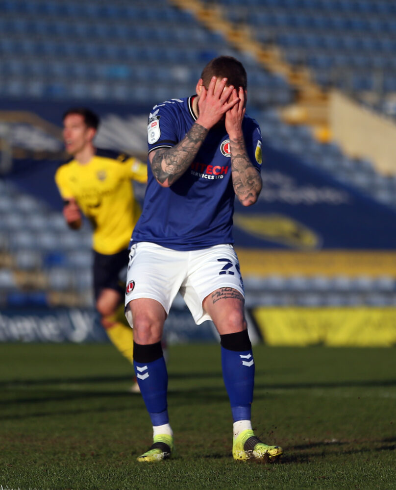 Charlton Athletic’s Ronnie Schwartz sees his penalty saved during the Sky Bet League One match at the Kassam Stadium, Oxford. Picture date: Saturday March 6, 2021.