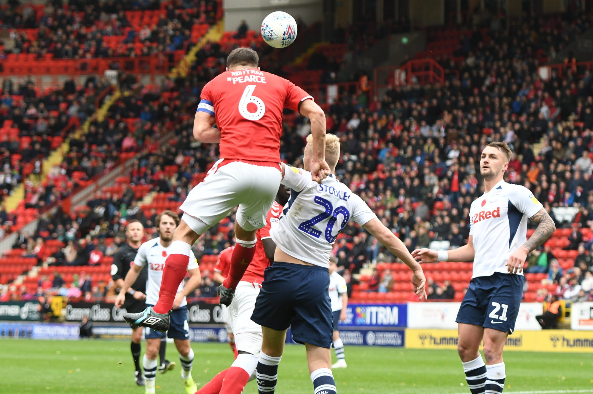 Jason Pearce wins a header during Charlton v Preston. Kyle Andrews