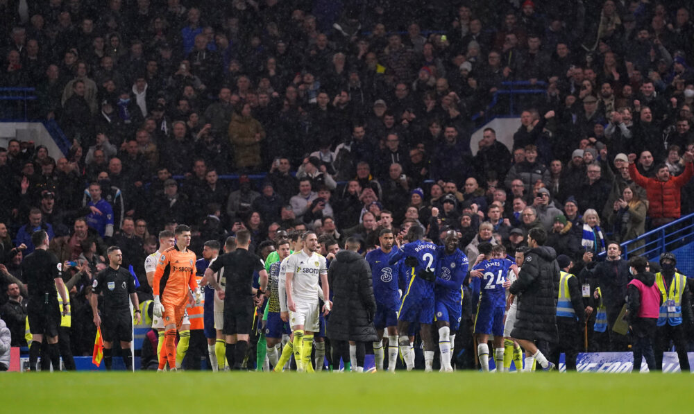 The game erupted at the end as tempers boiled over – with Leeds’ Junior Firpo and Kai Havertz squaring up twice, both times their heads locked horns.