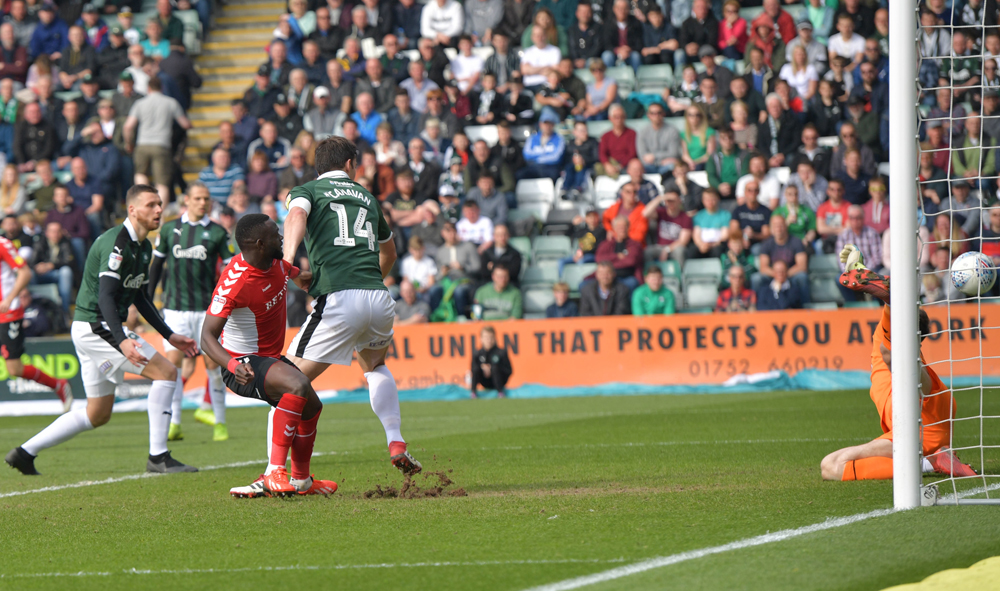 Plymouth Argyle’s Niall Canavan (centre) scores an own goal