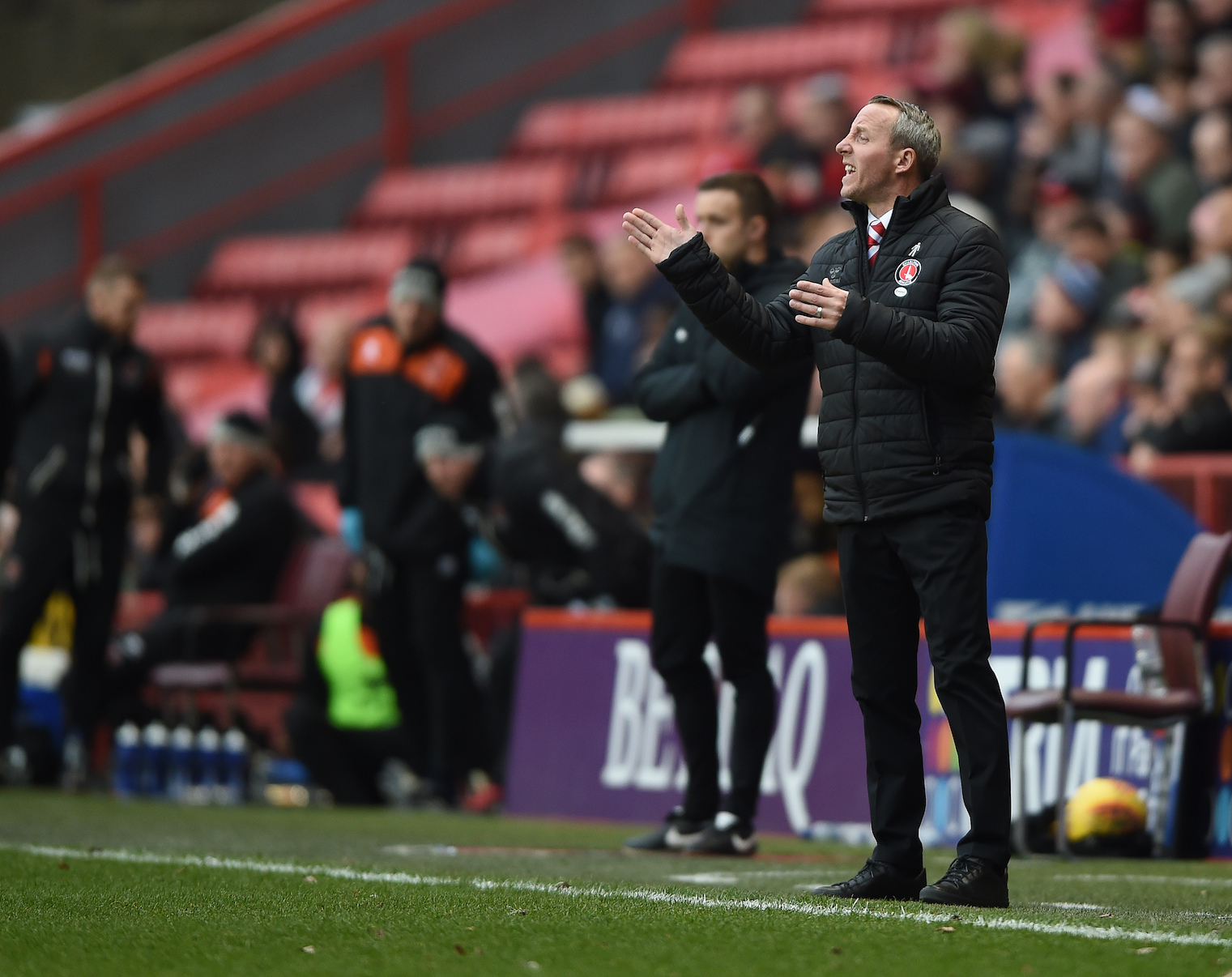 Charlton Athletic’s Lyle Taylor reacts after a tussle with Blackpool’s Curtis Tilt. Both players were booked.