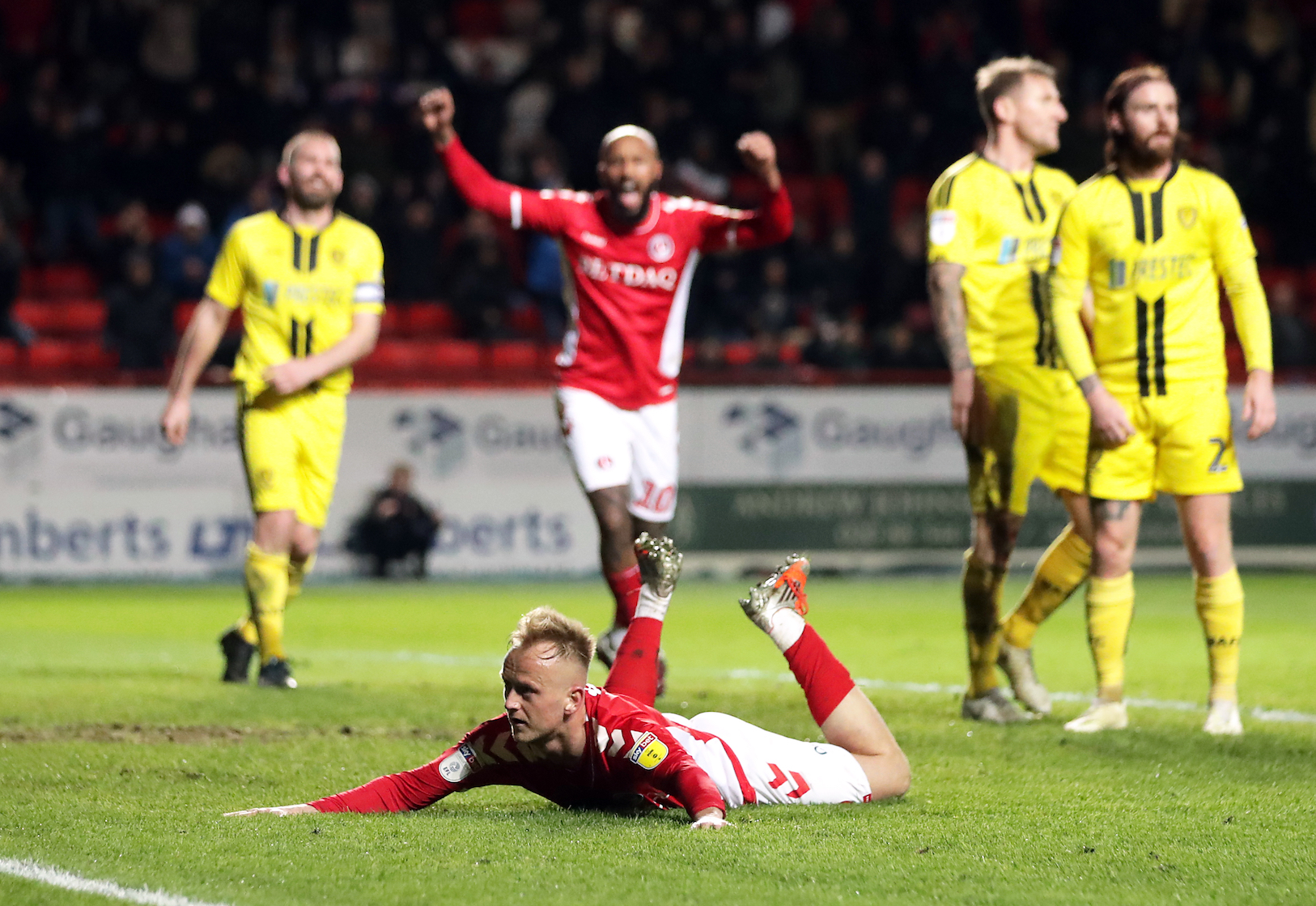 Charlton Athletic’s Ben Reeves (centre) celebrates scoring his side’s second goal of the game