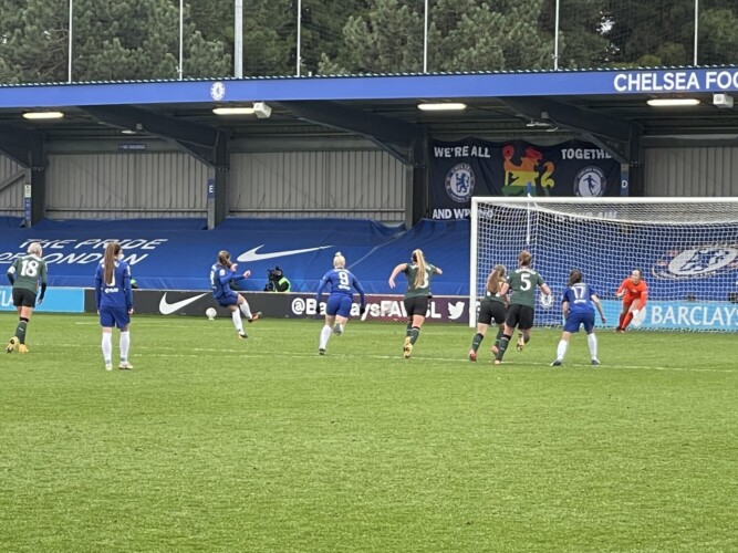 Spurs started off confidently, passing the ball, crisply and first time, but the first effort fell to the home side with Fran Kirby, and Guro Reiten combing well to feed in-running Sam Kerr. The Australia striker tried a side-footer, but was well wide of Aurora Mikalsen’s goal.