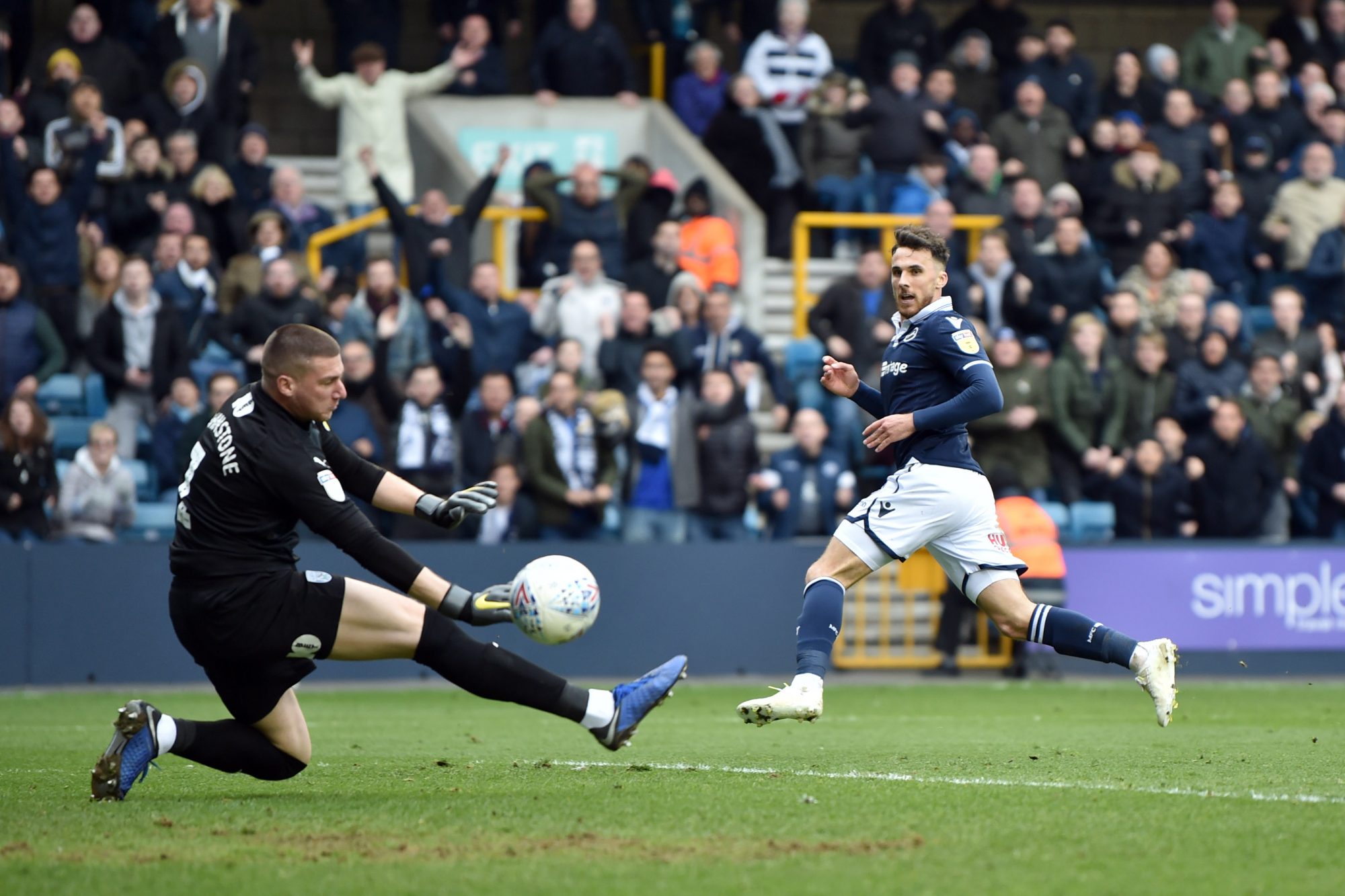 The Lions frontman had a big chance to score a third goal but his shot was kept out by the right knee of Baggies stopper Sam Johnstone.