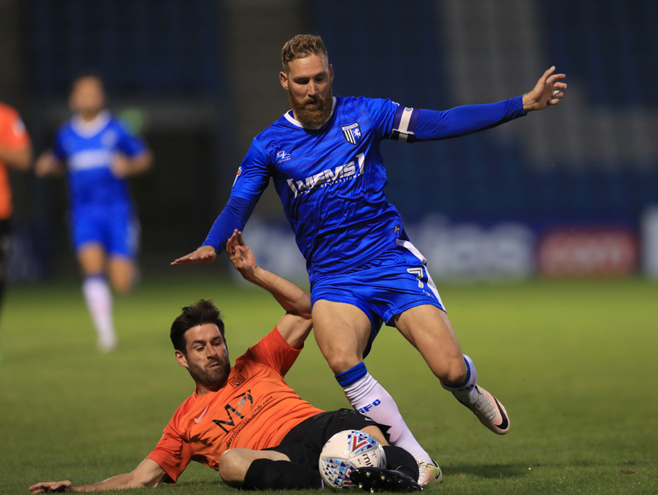 Gillingham’s Scott Wagstaff is tackled by Southend United’s Michael Timlin