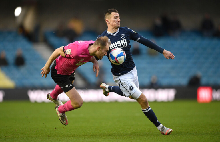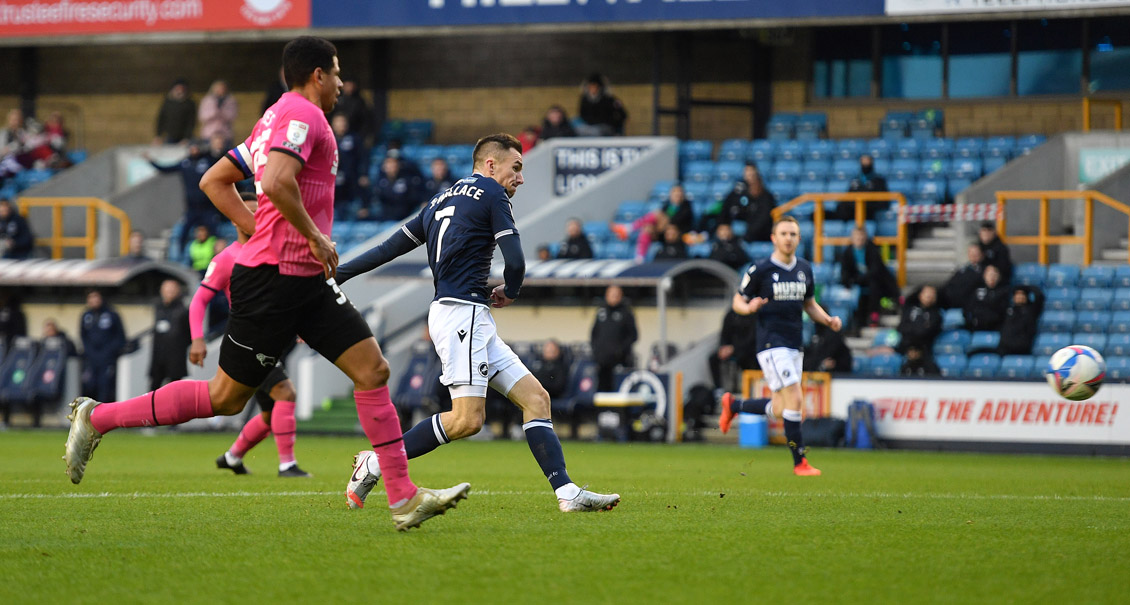Jed Wallace had a big chance in Saturday’s 1-0 defeat at The Den to Derby County but David Marshall denied him with a one-handed save.