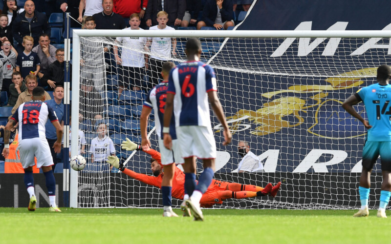 Maikel Kieftenbeld was adjudged to have fouled Grady Diangana right at the end of the first half. Karlan Grant’s kick was saved by Lions keeper Bart Bialkowksi.