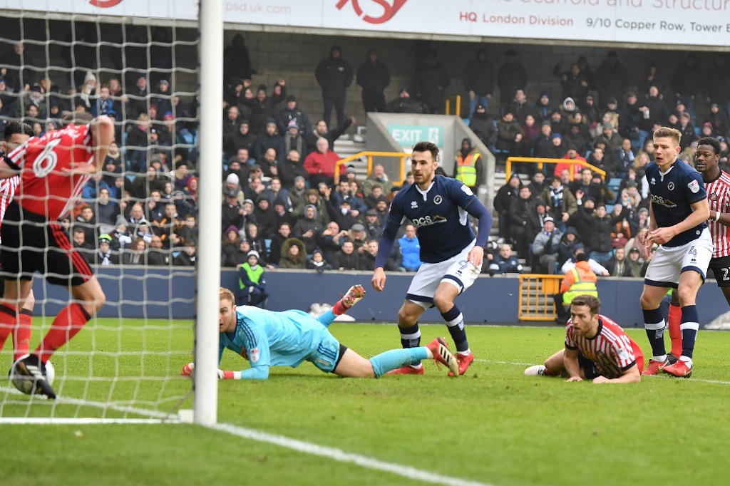 Millwall went close just before they did score their goal. The Sunderland keeper saved with his legs as Morison struck a first-time volley as he raced onto Jed Wallace’s cross, the ball going out for a corner.
