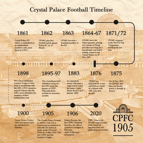 • the official CPFC supporters’ magazine from October 1947 states “to prevent misunderstanding, it should be pointed out that the Crystal Palace Club in existence before 1905 was a purely amateur concern and had no connection with the present club.”