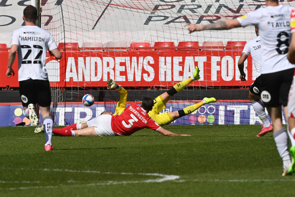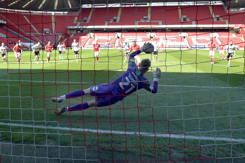 Alex Gilbey was brought down by Frankie Kent but Bursik, born in Lambeth and formerly on AFC Wimbledon’s books, dived to his left to push away Stockley’s attempt.
