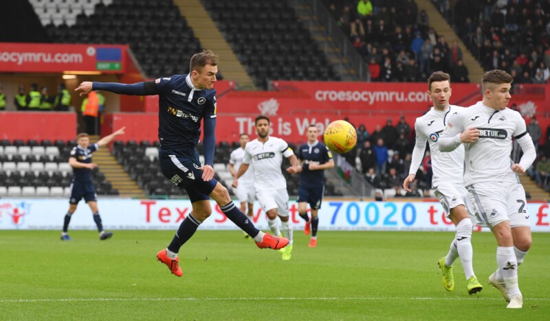 Millwall continued to pile on the pressure – this time Jed Wallace forced the Swansea shot-stopper into an acrobatic save from his well-struck volley.