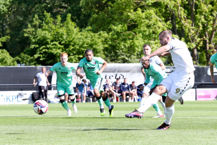 Michael Cheek of Bromley scores from the penalty spot during the League 2 match between Bromley and Cheltenham Town at Hayes Lane, Bromley, England on 3rd May 2025. Photo by Edmund Boyden.