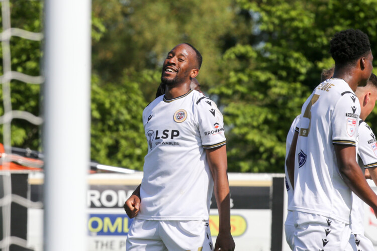 Nicke Kabamba of Bromley celebrate scoring the second goal during the League 2 match between Bromley and Cheltenham Town at Hayes Lane, Bromley, England on 3rd May 2025. Photo by Edmund Boyden.