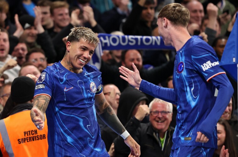 Pictured top: Goalscorer Enzo Fernandez, left gives thanks to goal provider Cole Palmer (Picture: Alamy)