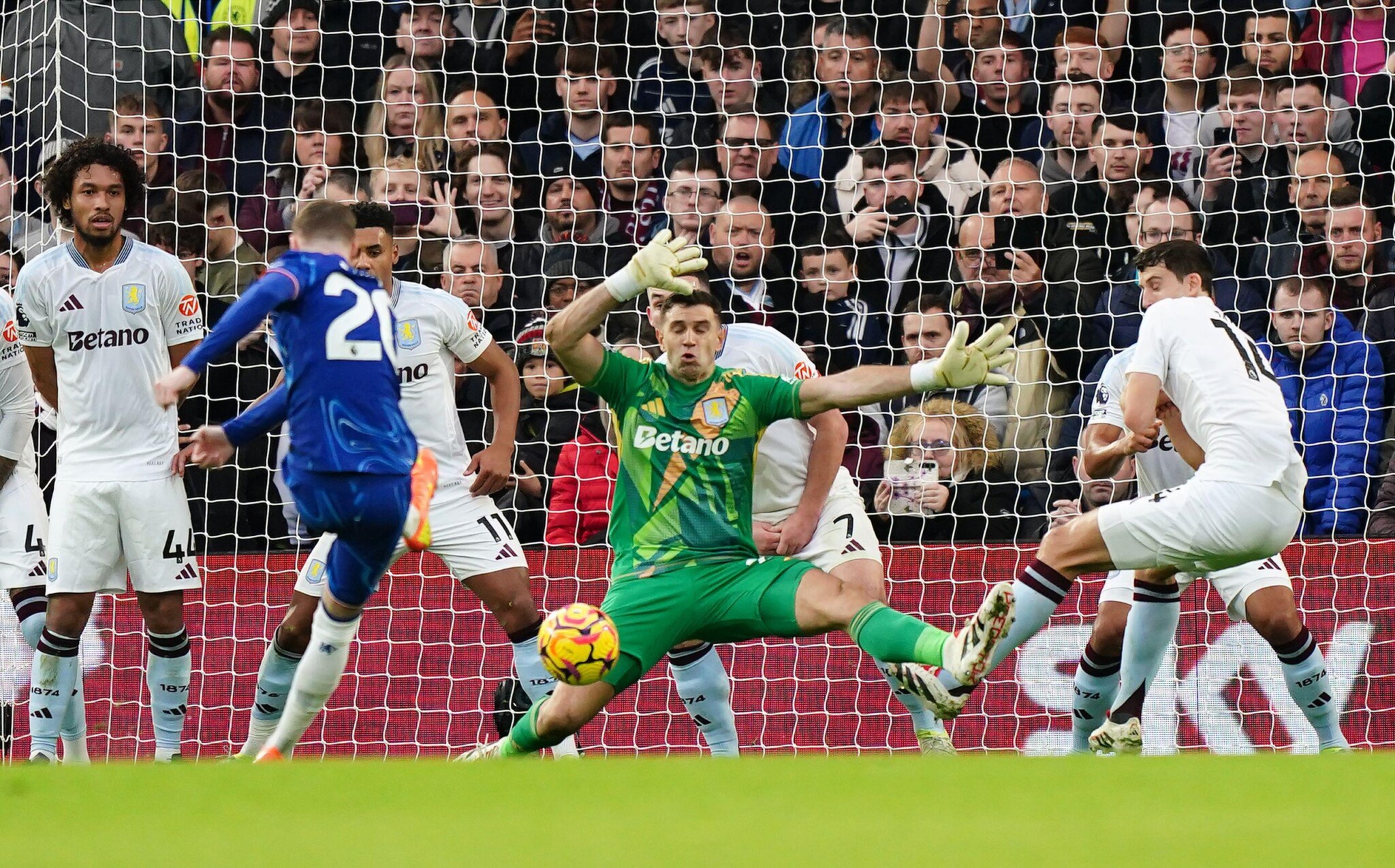 It’s always fun to see nine players massed on the goal-line. Nothing came of it as Villa managed to charge down the kick from Palmer and Lavia’s follow up. Emi Martinez celebrated as if a penalty had been saved.
