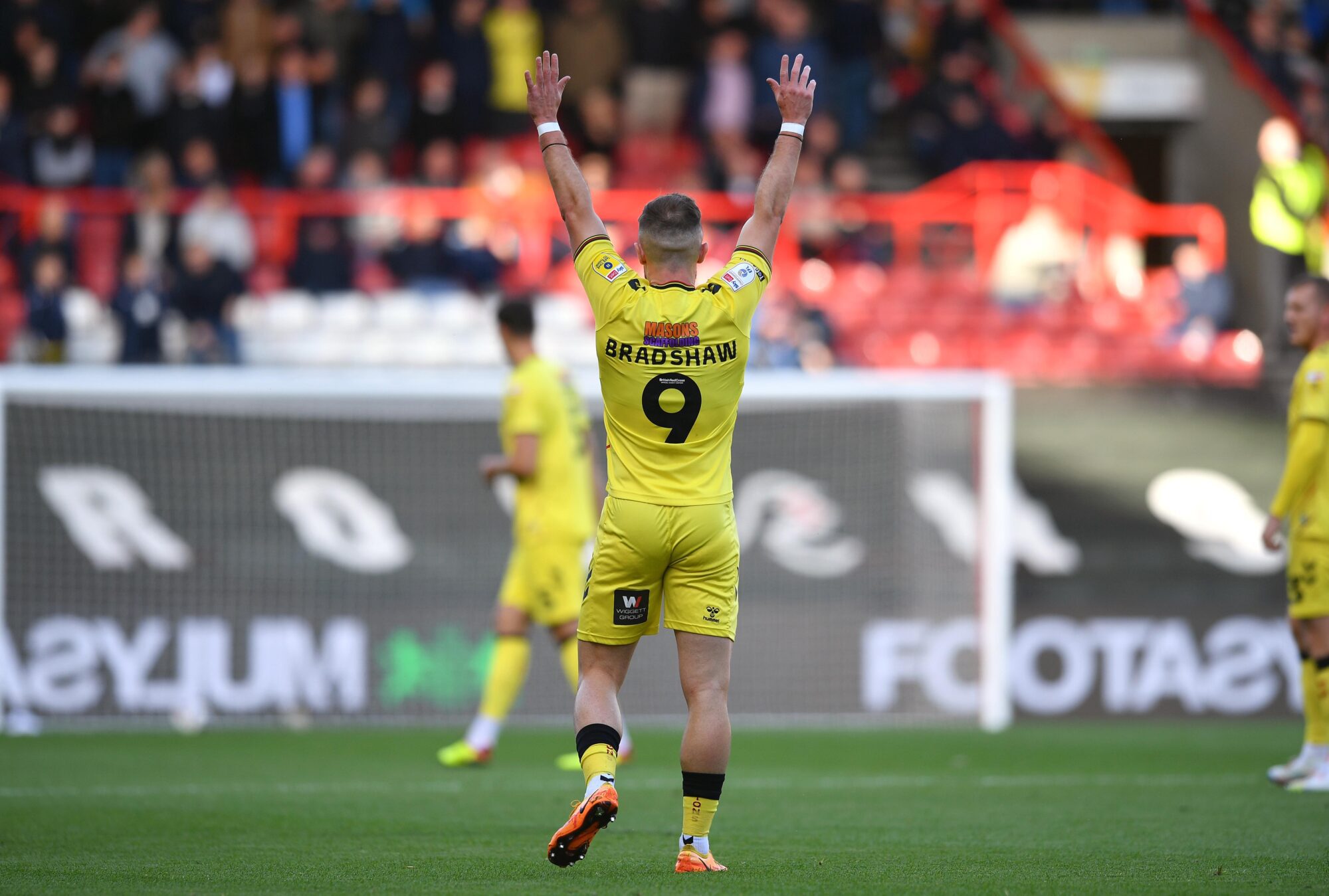 Bradshaw scored the opening goal just before half-time. His first effort was blocked but he got back up and fired the away side ahead, breaking his duck for the campaign.