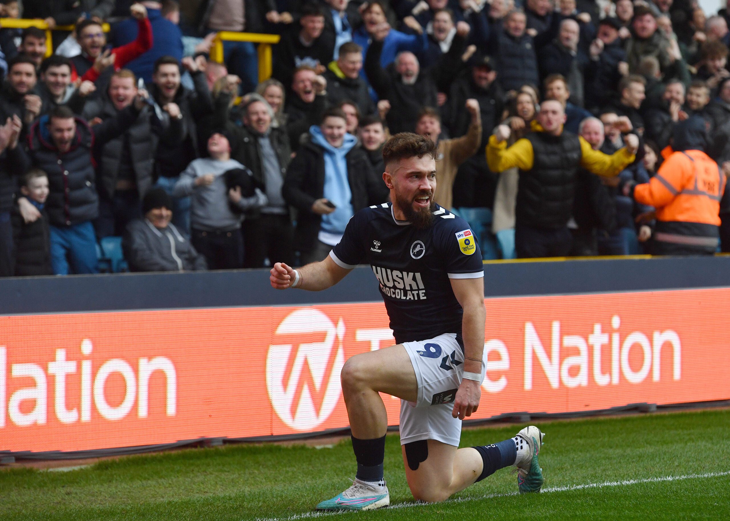 Tom Bradshaw reacts to his hat-trick for Millwall against high-flying Sheffield United