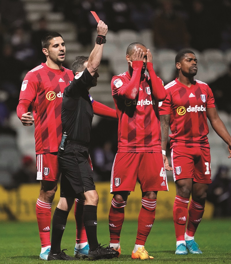 Denis Odoi was sent off in Tuesday night’s 2-1 loss at Preston, who also played the second half with 10 men.