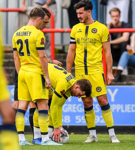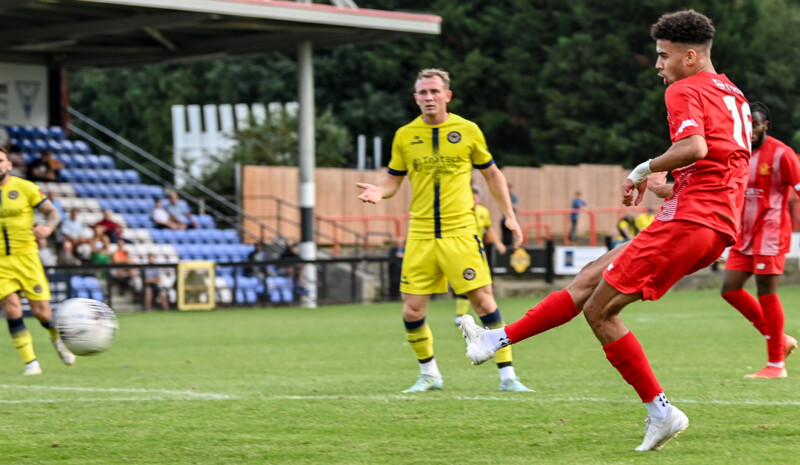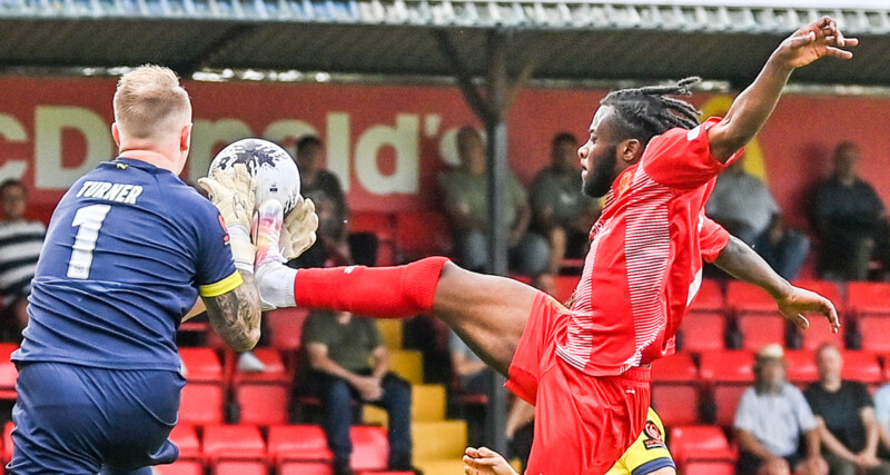 Early in the second half Papadopoulos had a free-kick from a similar position and the Farnborough defensive wall didn’t do much better than Welling’s. His strike hit one of the defenders, and fortunately for the visitors, it flew just wide of the post with Jack Turner a mere onlooker.