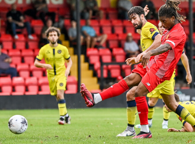 Papadopoulos had a shot saved by Turner before Farnborough should have been reduced to 10 men. Substitute Jayden Davis had already been cautioned for a foul in the first half and committed another blatant yellow card offence with just over 10 minutes remaining. Referee George Warren showed incredible lenience and although, shortly after, he suffered that embarrassment of being a substituted substitute, the visitors were allowed to continue with their full quota of 11.