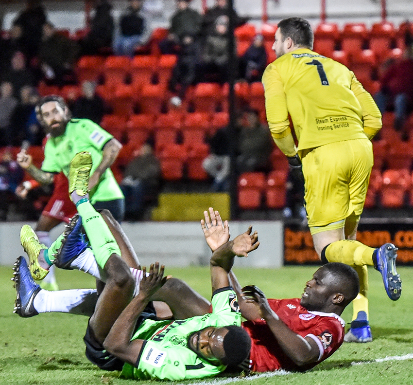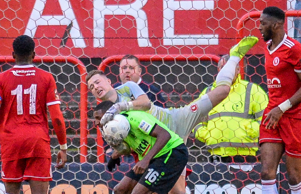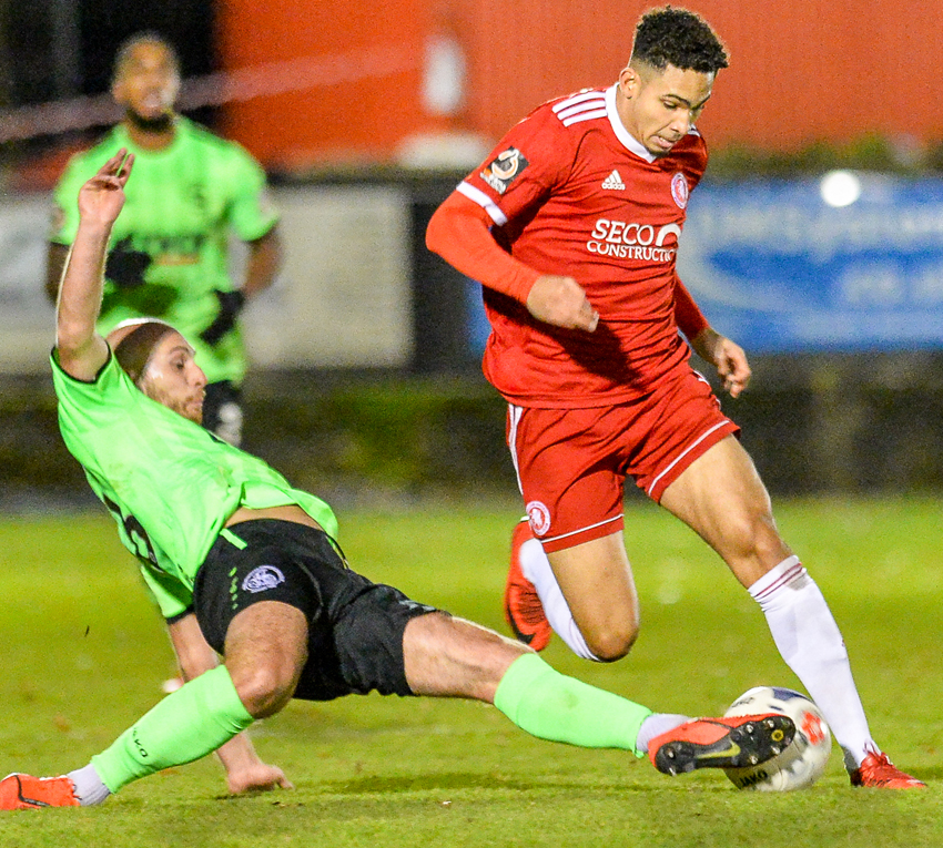 Then came Ashford’s dismissal. As he stretched to try and stop a Welling move down the wing, he lost control and left Connor Dymond in a heap. Although not appearing to be malicious, his studs were raised and referee Michael Ryan had no option other than to show him a red card.
