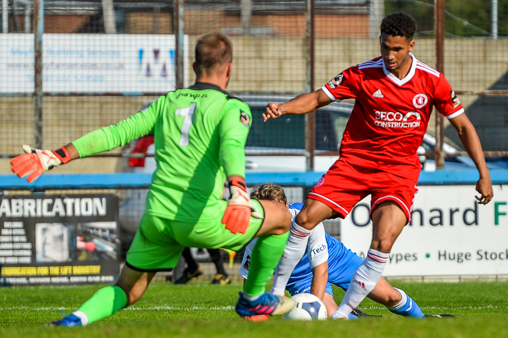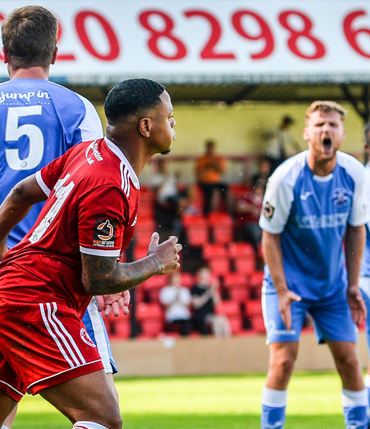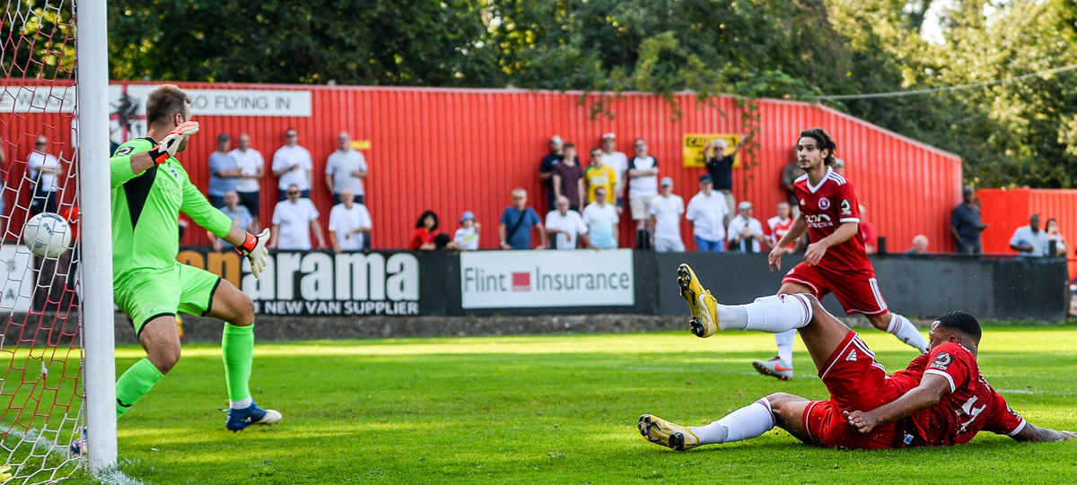 However, not to be outdone, the Angels pulled one back approaching half time. A free kick was not cleared and Rob Swaine could only head across the face of goal where Dulwich Hamlet loanee Adam Yusuff showed his predatory instincts to head home.