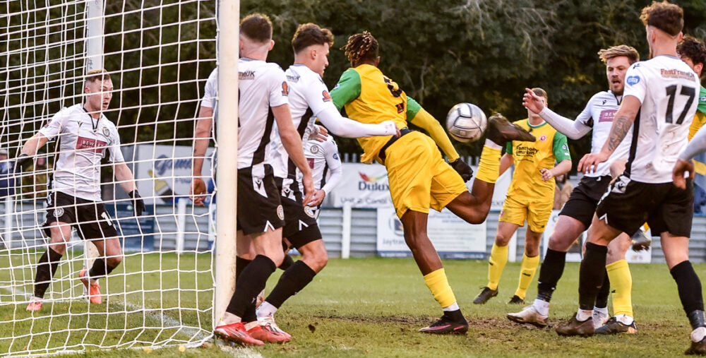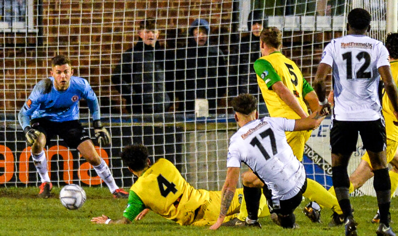 Che Krabbendam missed two opportunities for Welling, first when his volley missed the near post and then blasting over when it sat up nicely for him after Barnes’ cross had not been cleared properly.
