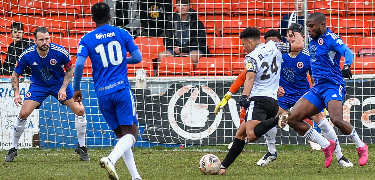Ward breathed a sigh of relief when Alexander’s shot from Ezennolim’s cross was deflected just wide of the far post having sent him the wrong way. However, it was the hosts who almost finished the half with a goal. Dylan Adjei-Hersey cut in from the left and curled just wide with Myles Roberts struggling to get across having lost his footing.