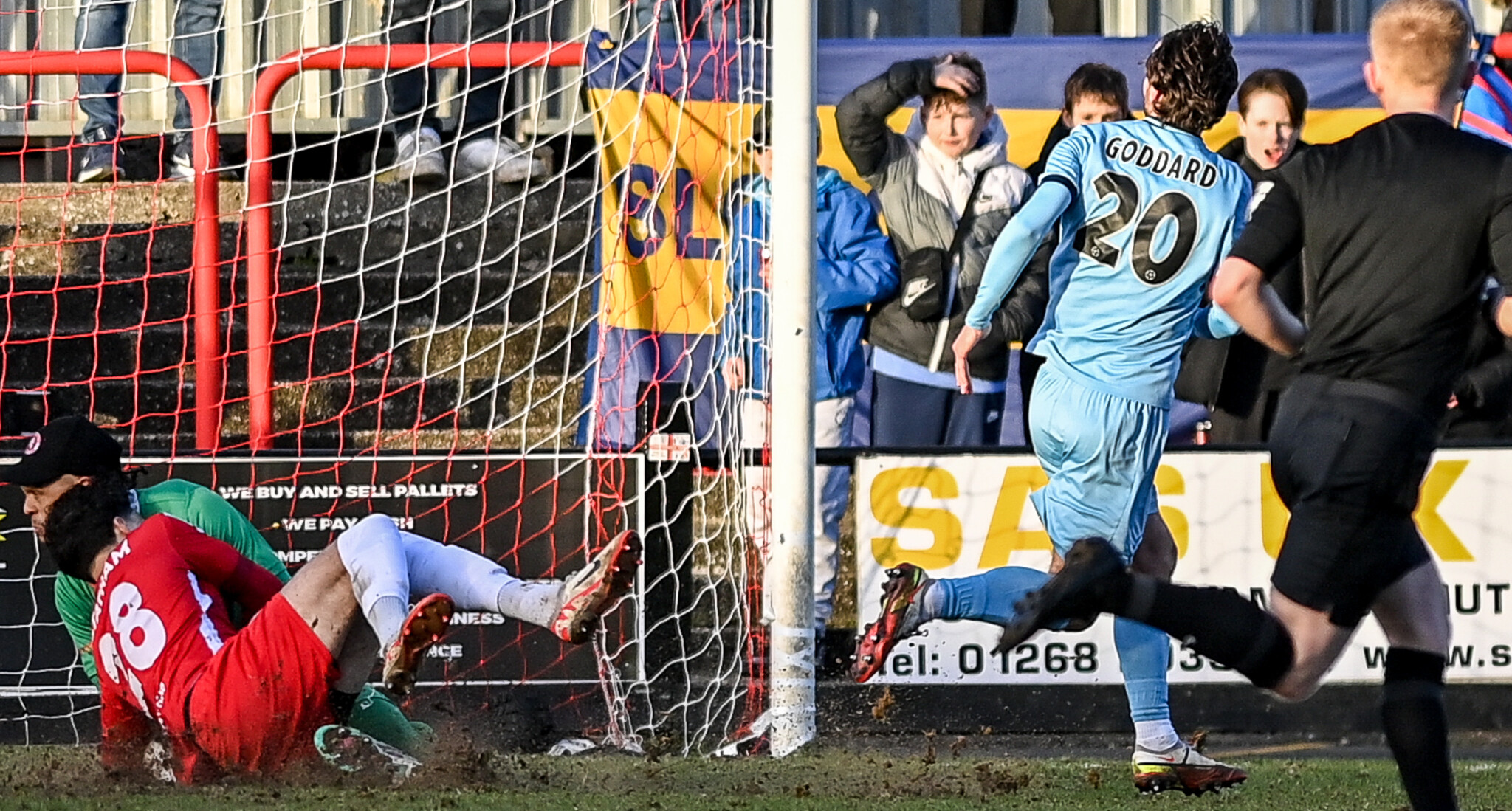Smelling blood, Slough started playing a very direct game, either launching long, high passes at their two big strikers, or trying to put deep diagonal crosses behind the Welling backline. The defence did well to limit Slough to hopeful shots that did not trouble Lovett until their rearguard action was finally broken with six minutes remaining. Player-manager Scott Davis sent over one of his trademark long diagonal passes forward, Goddard controlled it superbly, and that allowed him to slot it home.
