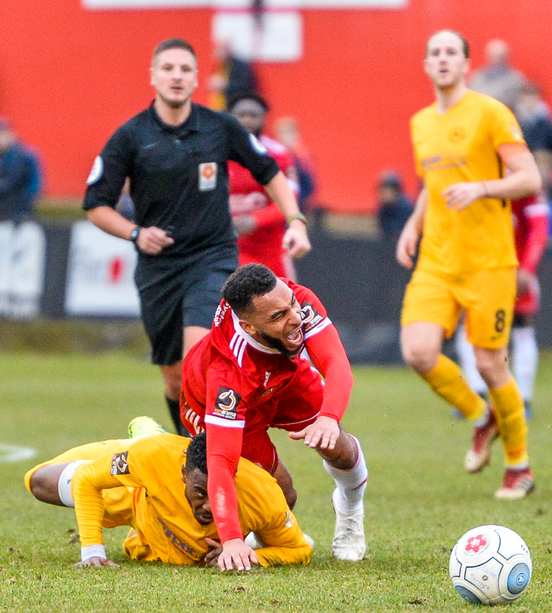 He was fortunate not to receive a second caution for a terrible challenge on Barham. Less than a minute later he fouled Mills and did see red.