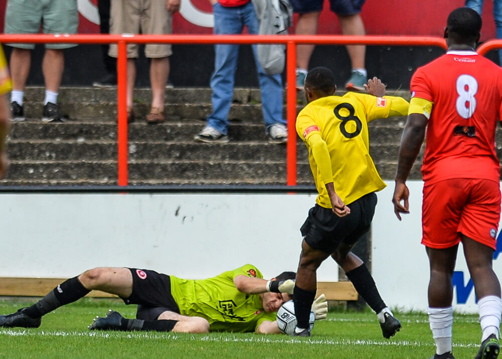 Tom Smith, back after injury, was out quickly to thwart James Ewington before Welling created a rare opening as Chi Ezennolim’s long pass picked out Kristian Campbell, who got past his man with the aid of a great first touch. However, when he looked up to cross there was nobody in the penalty area so he had to pull it back to Dipo Akinyemi, who hacked his shot high over the bar.