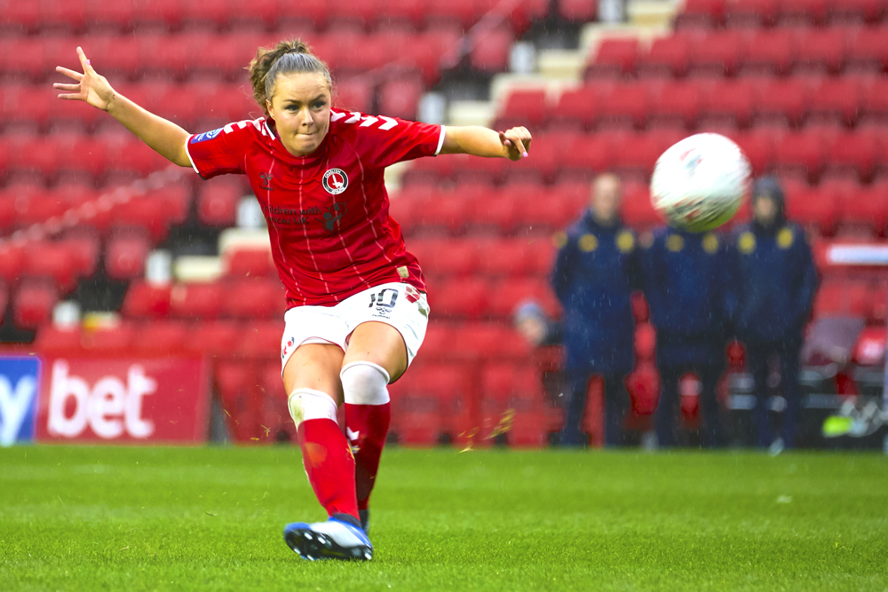 Picture: Charlton’s Sara Eggesvik (20) and Rachel Newborough (three) in action at The Valley on Saturday; Charlie Devlin has a shot