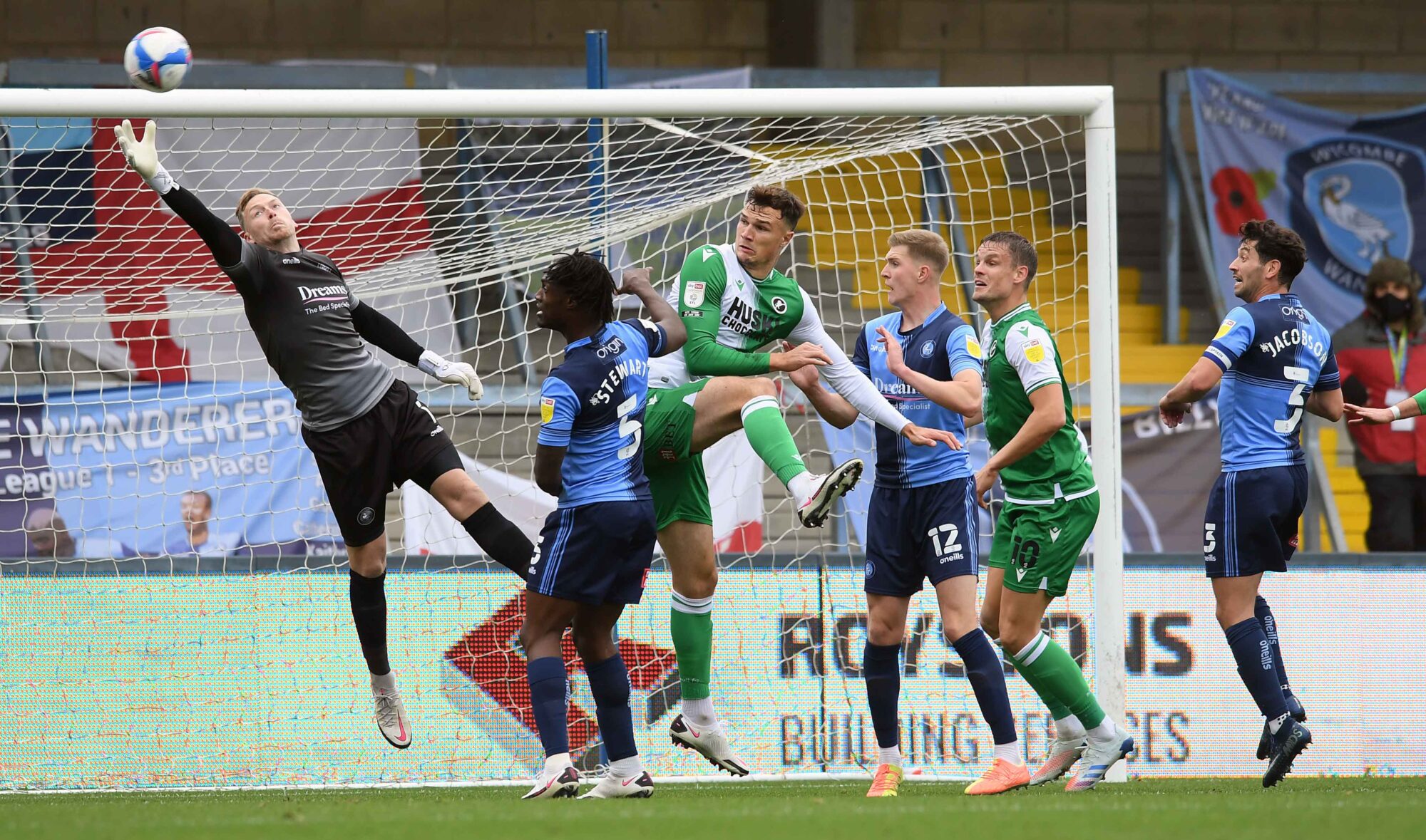 “We deserved more out of today,” said Wanderers boss Ainsworth. “If anybody sees that corner that we scored from today, then please, please tell me what is wrong with that. The referee’s given a foul, the fourth official said there was a foul on the keeper, but there’s absolutely nothing [there].