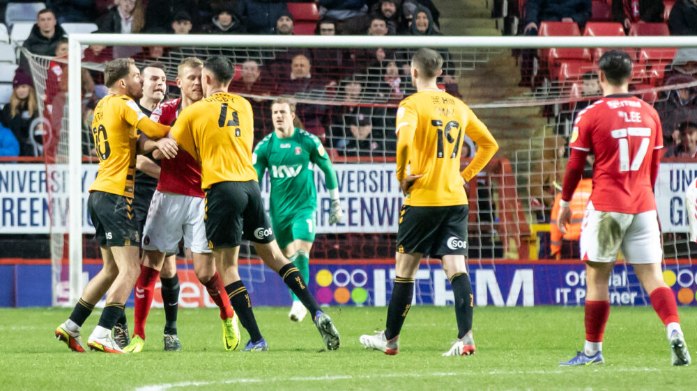 “There were no punches or headbutts, it was just grappling. That would normally be two bookings but the ref seemed to lose a little bit of control for that whole first half. He seemed to be in a bit of a daze and booked people for time-wasting when they weren’t. It got a little bit out of hand.