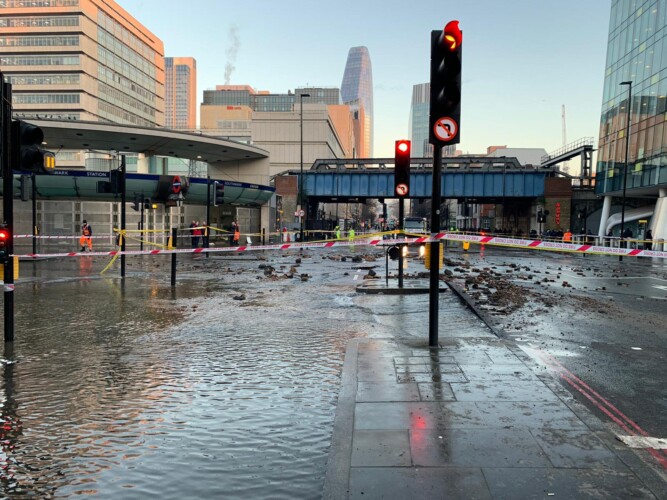 Pictured top: A water main burst in 2020 flooding outside Southwark Tube station (Picture: London Fire Brigade)