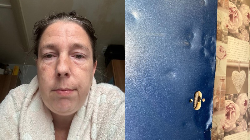 Pictured top: Julie Bull and a picture of her front door which has been broken for a year (Picture: Julie Bull)
